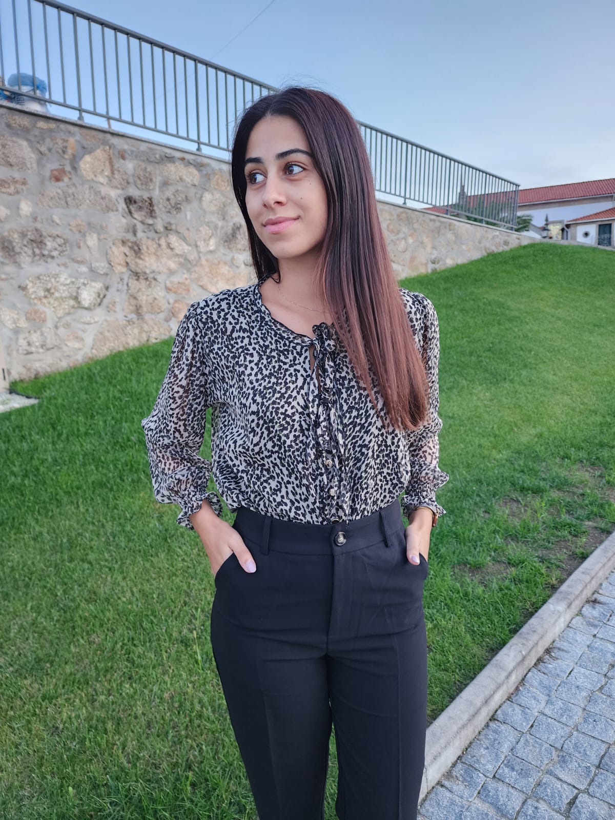 Calças de corte clássico, em tecido estruturado preto, com cintura subida que valoriza a silhueta. Possui botão e fecho frontal discreto, além de bolsos laterais funcionais.