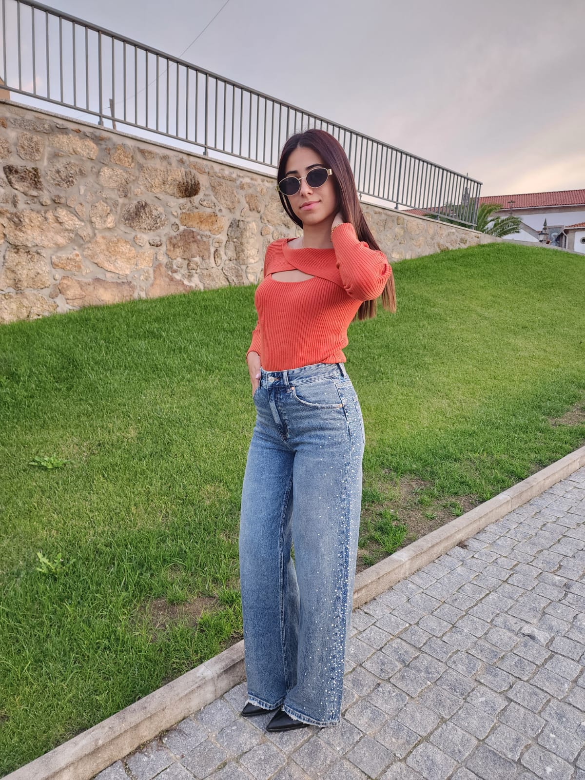 Camisola de manga comprida em malha canelada laranja, que proporciona elasticidade e valoriza a silhueta. Decote assimétrico com recorte central, dando um toque moderno e ousado. Caimento justo ao corpo, evidenciando as curvas de forma elegante.