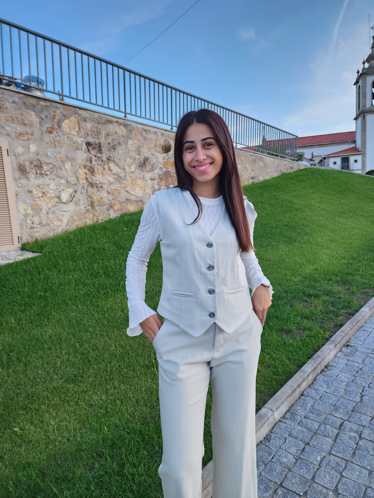 Este colete feminino é uma peça de alfaiataria contemporânea, com um corte elegante que valoriza a silhueta. Confeccionado em tecido de tom claro (bege ou off-white), transmite leveza e sofisticação.