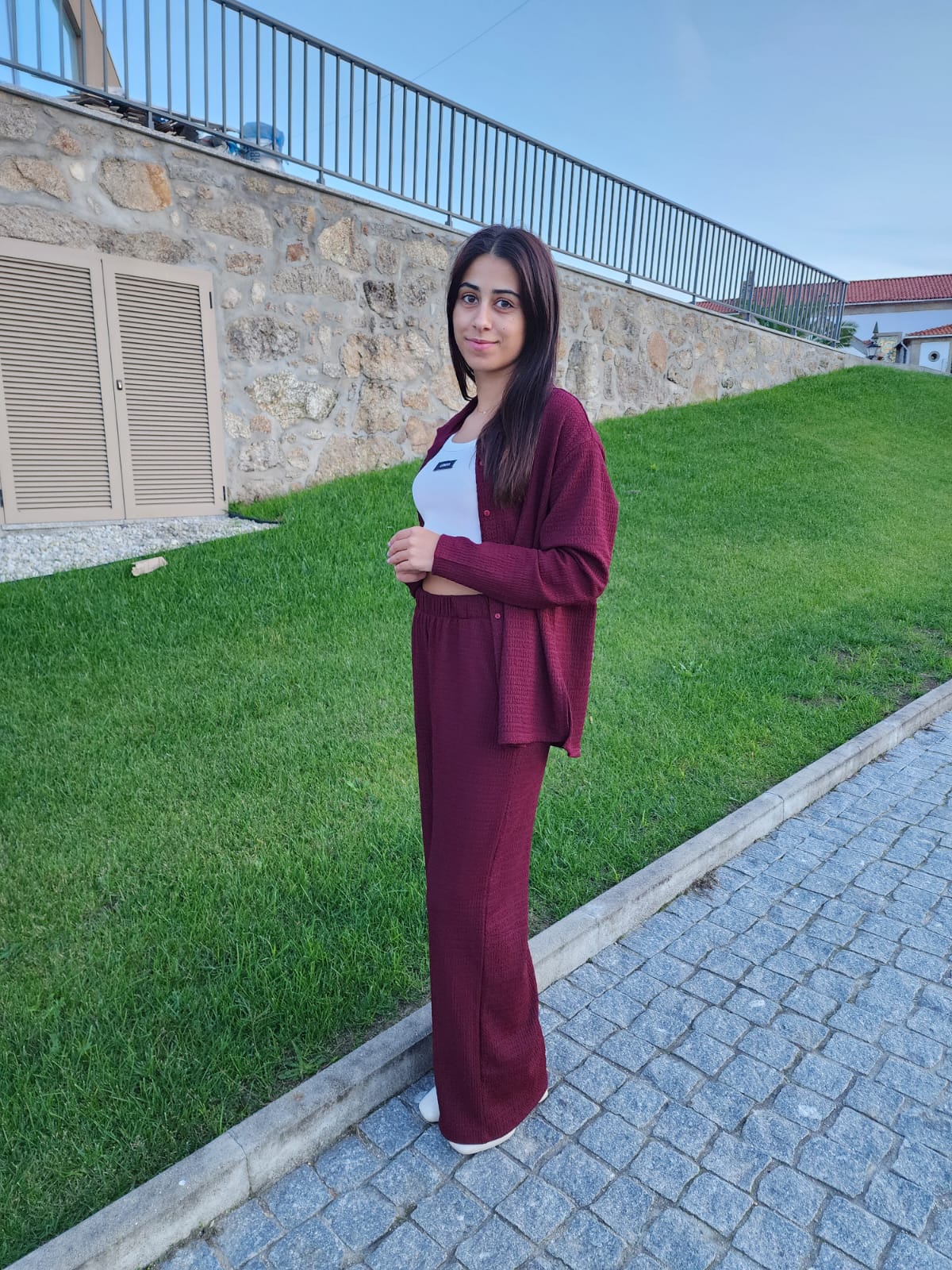 O look é composto por um conjunto coordenado em tom bordo. A parte de cima é uma camisa de manga comprida, em tecido leve e com corte solto, usada aberta para um estilo descontraído. Por baixo, surge um top cropped branco justo, que cria contraste e dá frescura ao visual.