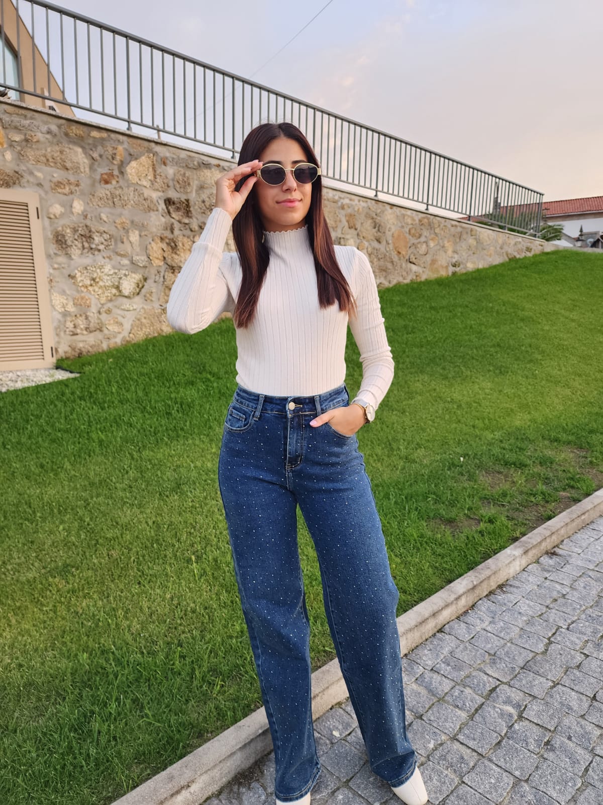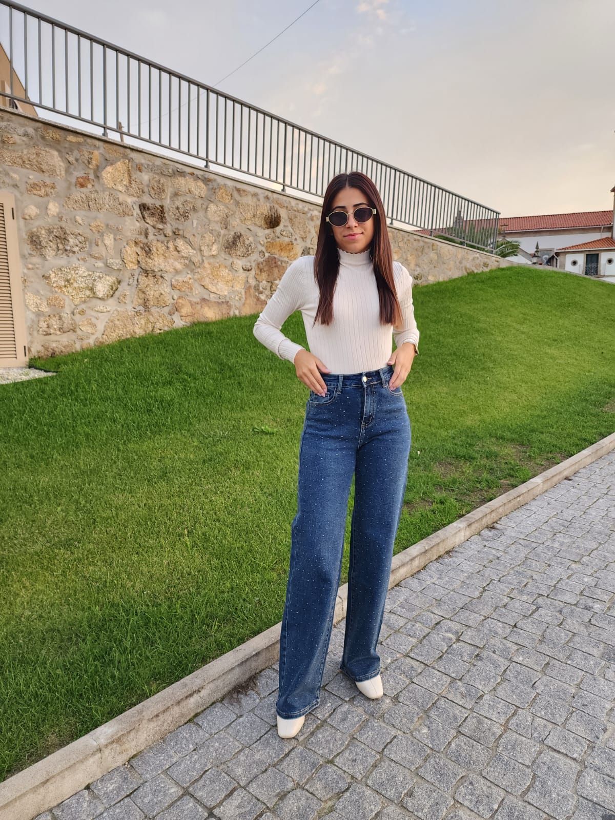 Estes jeans de perna larga são perfeitos para quem gosta de unir conforto, estilo e um toque de glamour. O corte amplo garante movimento e elegância, enquanto os pequenos brilhantes aplicados na parte da frente trazem um detalhe delicado e cheio de charme. Com uma modelagem moderna e versátil, esta peça transforma qualquer look básico em algo especial
