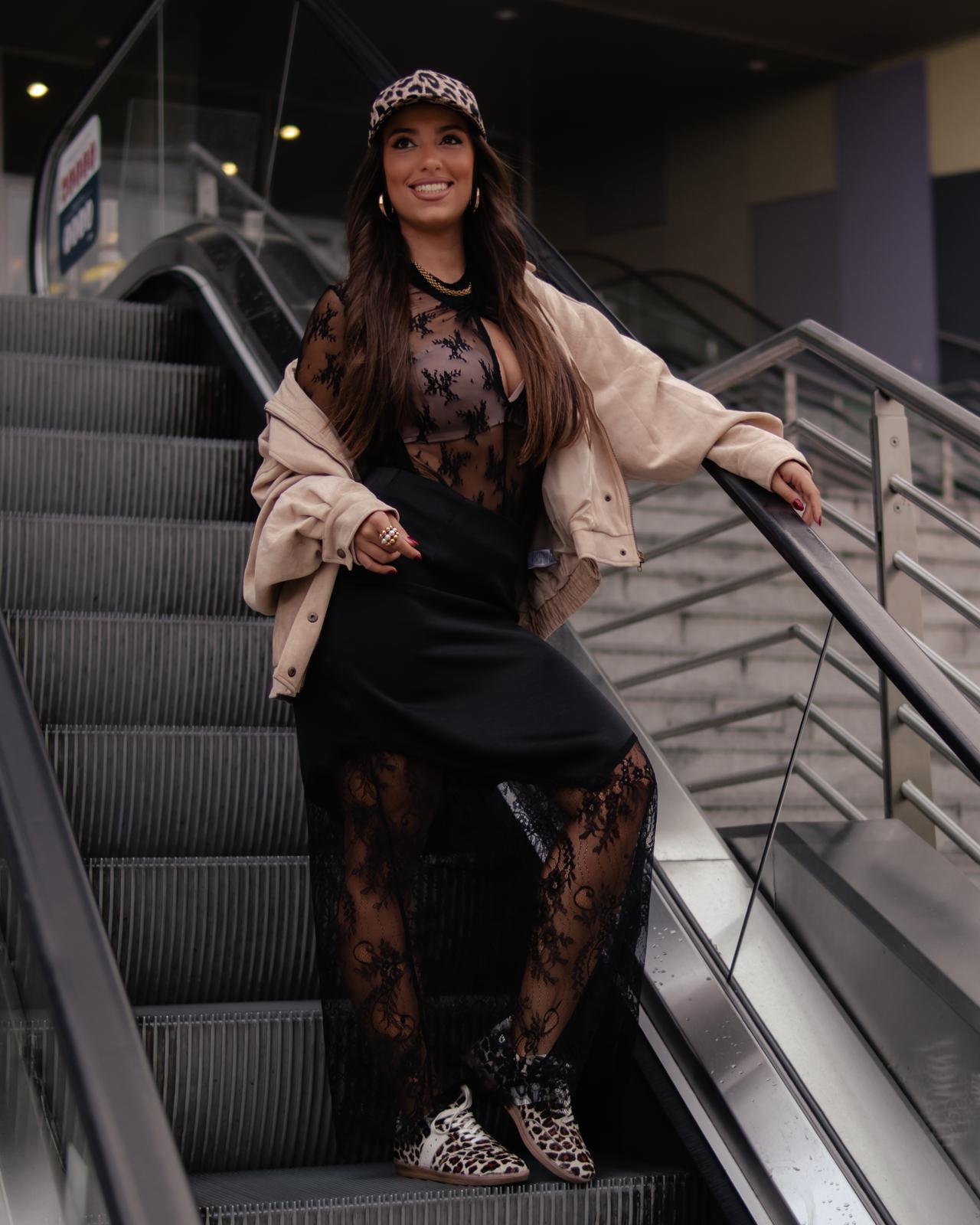 Saia em  tecido opaco contrasta com a transparência da renda, resultando num visual sensual mas refinado.