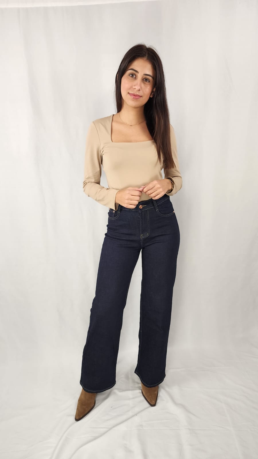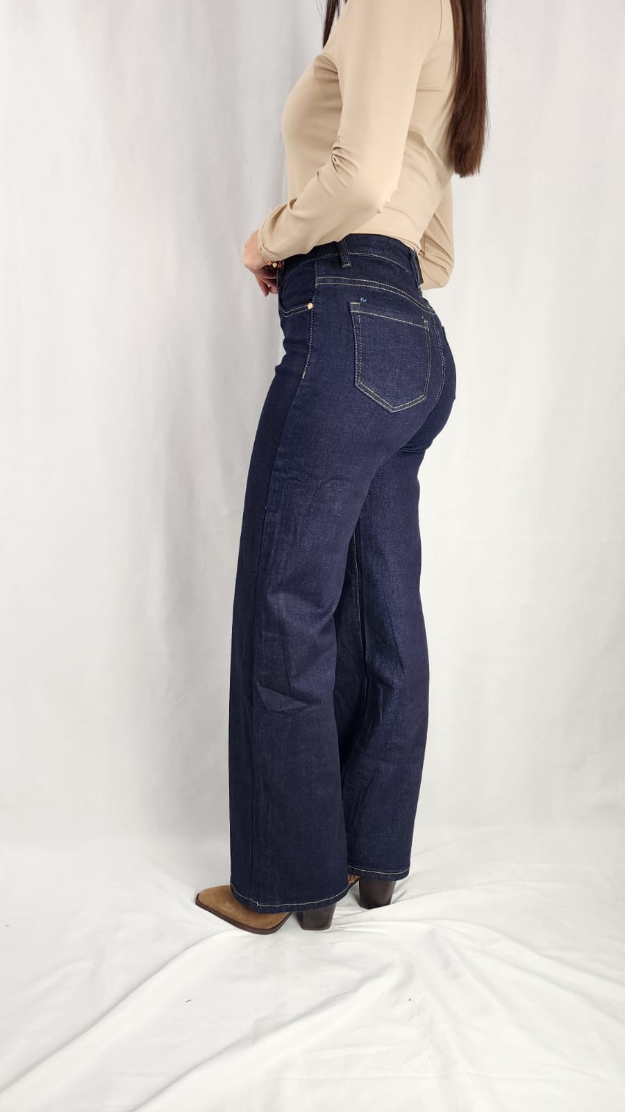 Calças de ganga azul-escuro, cintura alta e corte reto, com costuras contrastantes que alongam a sinueta. Versáteis e elegantes para qualquer ocasião.