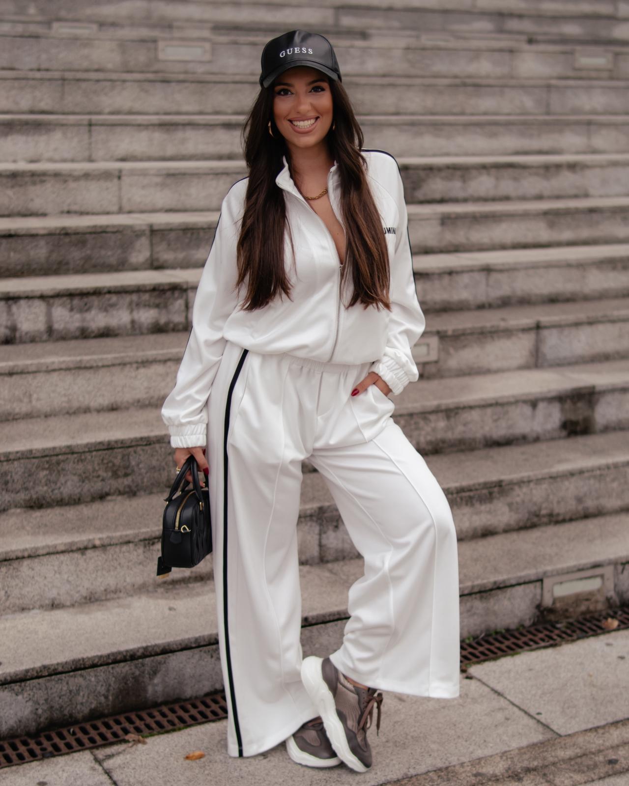 Calças de corte largo seguem a mesma linha estética — brancas com risca preta lateral, cintura elástica confortável e caimento fluido, que alonga a silhueta e transmite movimento. O design é minimalista, mas de grande impacto visual.