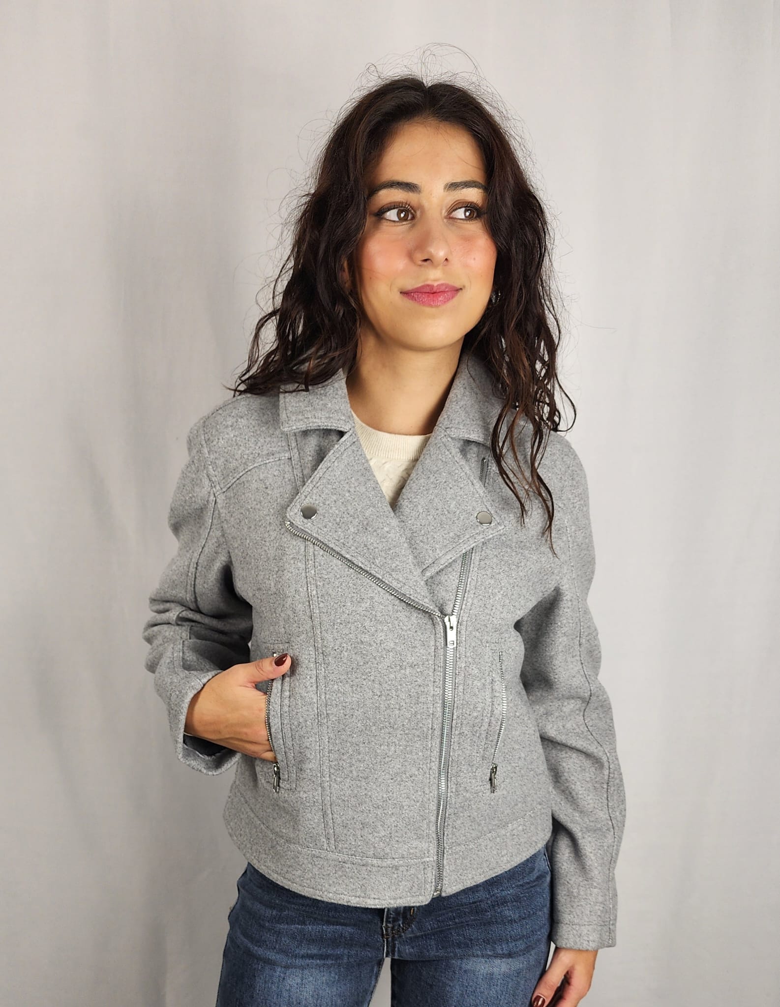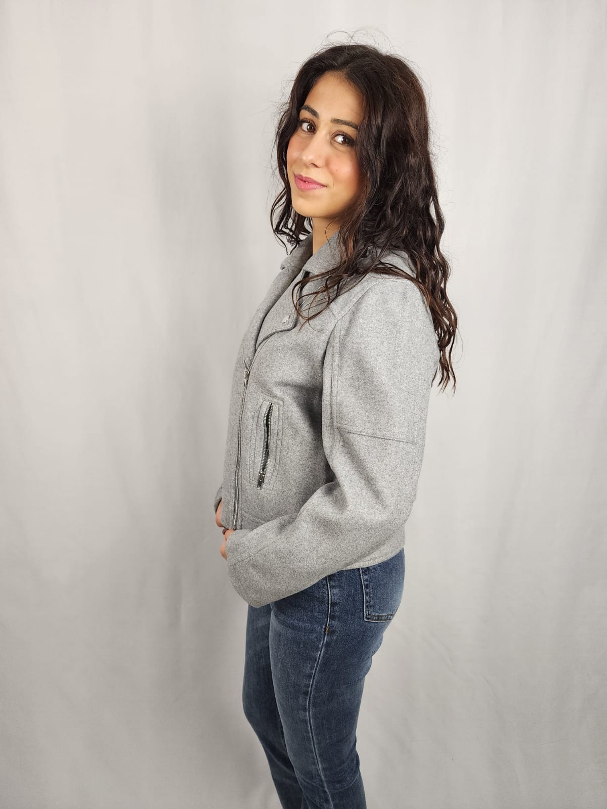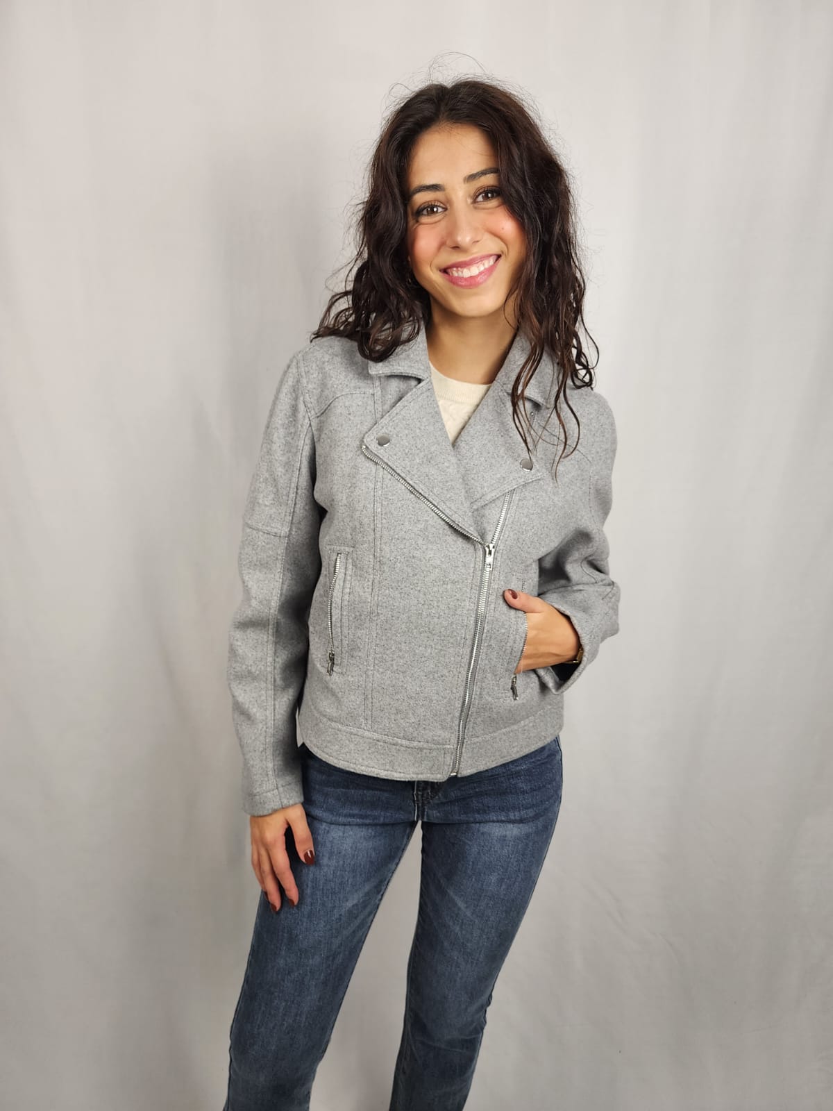 Este casaco cinzento, moderno e elegante com fecho assimetrico e bolsos laterais com fecho. Corte ligeiramente curto. Tecido exterior 80% Poliéster e 20% Viscose. Forro 100% Poliéster.
